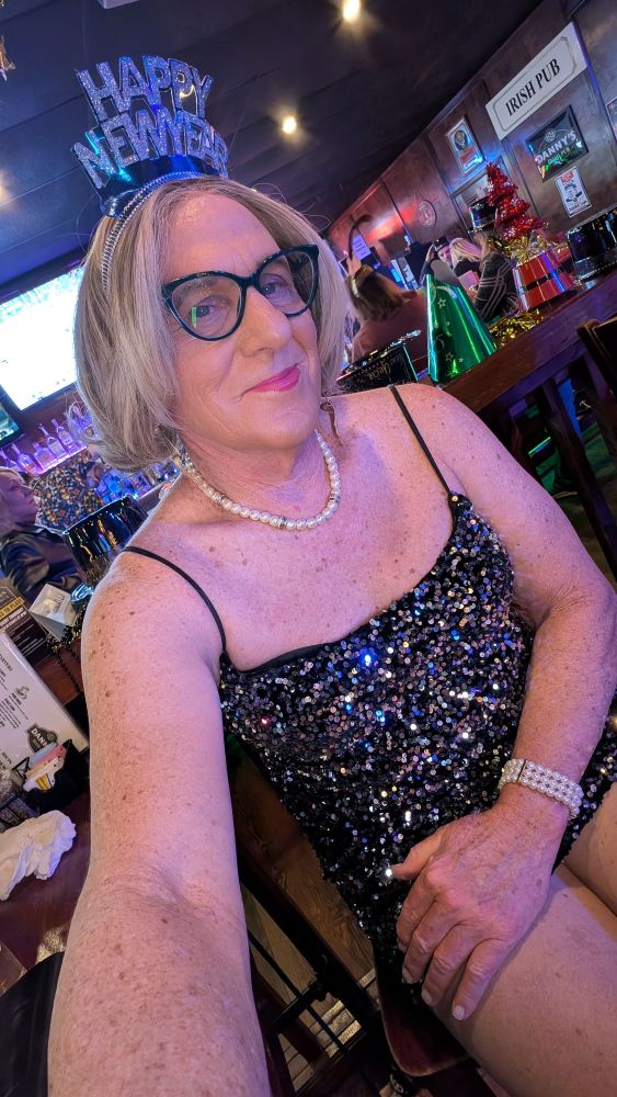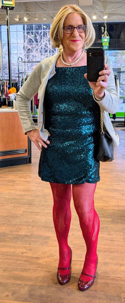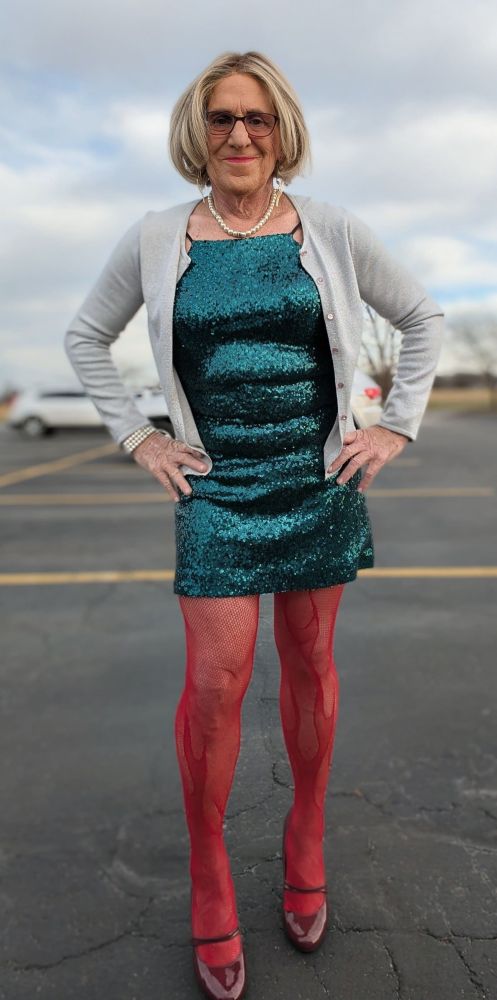 My wife and I didn’t have any plans for New Year’s Eve, and my GG friend Michelle was going out with a couple of her co-workers, so she invited me along. I cleared it with my wife about a week before, and she was OK with it (it turned out we got a joint invitation to a NYE tennis party at our club, so my wife when to the tennis party and I glammed up and joined Michelle). I wore a NYE suitable dress; a silver sequin dress, one of four dresses I have in the same style–multi-color, red, blue, and this silver one, my latest addition.
