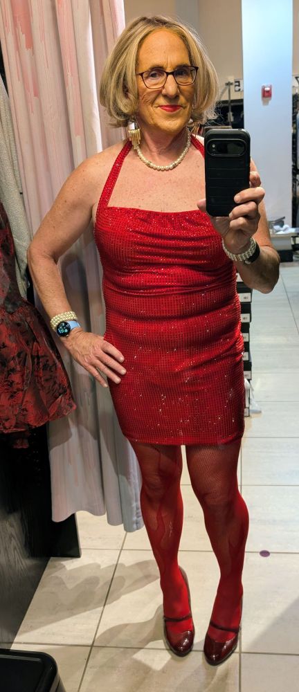 She said hers was an Akira dress and pulled the largest size they had for me to try on (I did, but it was too small, and they didn’t have it in larger sizes). At the same time, I noticed and pulled on a sparkly red dress, because girls can never have enough short sparkly dresses.